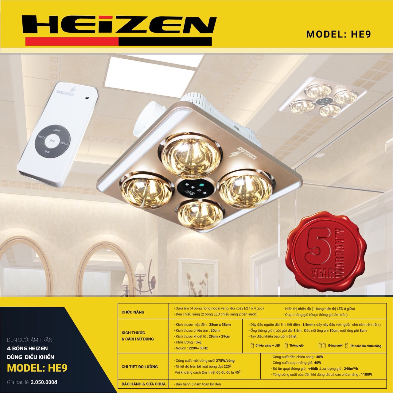 Đèn sưởi nhà tắm âm trần có điều khiển, đèn led, báo nhiệt độ Heizen HE9